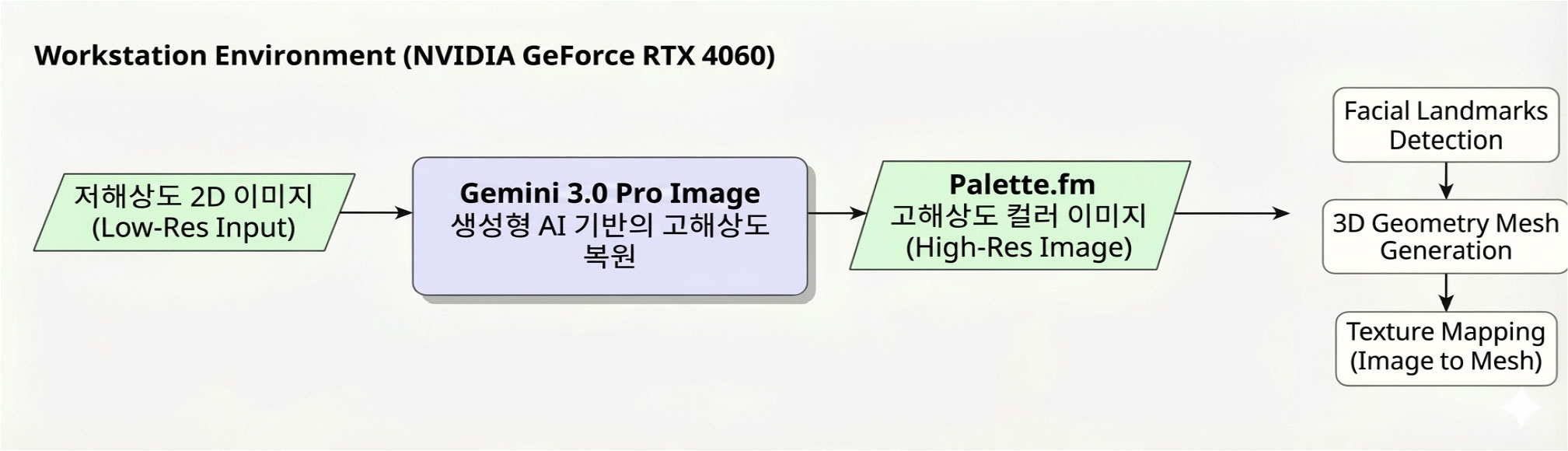 - 본 연구는 대한민국의 역사 교육에서 반복적으로 다루어지는 주요 위인들의 단색 또는 저해상도의 이미지를 AI를 활용한 해상도 복원 (Super–Resolution) 및 색채 복원(Colorization) 기술을 통해 생생하게 재현 하는데 목표를 삼고 있다. 나아가 2D 이미지를 바탕으로 3D 복원 및 이를 다중 시점 이미지로 변환한 뒤 디지털 홀로그램으로 구현하고자 한다. 이는 미래 역사 교육, 교육 콘텐츠 개발뿐만 아니라 디지털 문화유산 보존이라는 측면에서도 연구적, 사회적 의미를 지닌다. 실험은 대한민국 초·중·고 역사 교육에서 중요하게 다뤄지는 9인 위인의 흑백 및 저해상도의 이미지로 AI를 이용한 색복원 및 해상도를 업그레이드 하고 이후 깊이 추정 및 다시점 이미지 합성, 홀로그램 인코딩의 전과정을 수행한다.