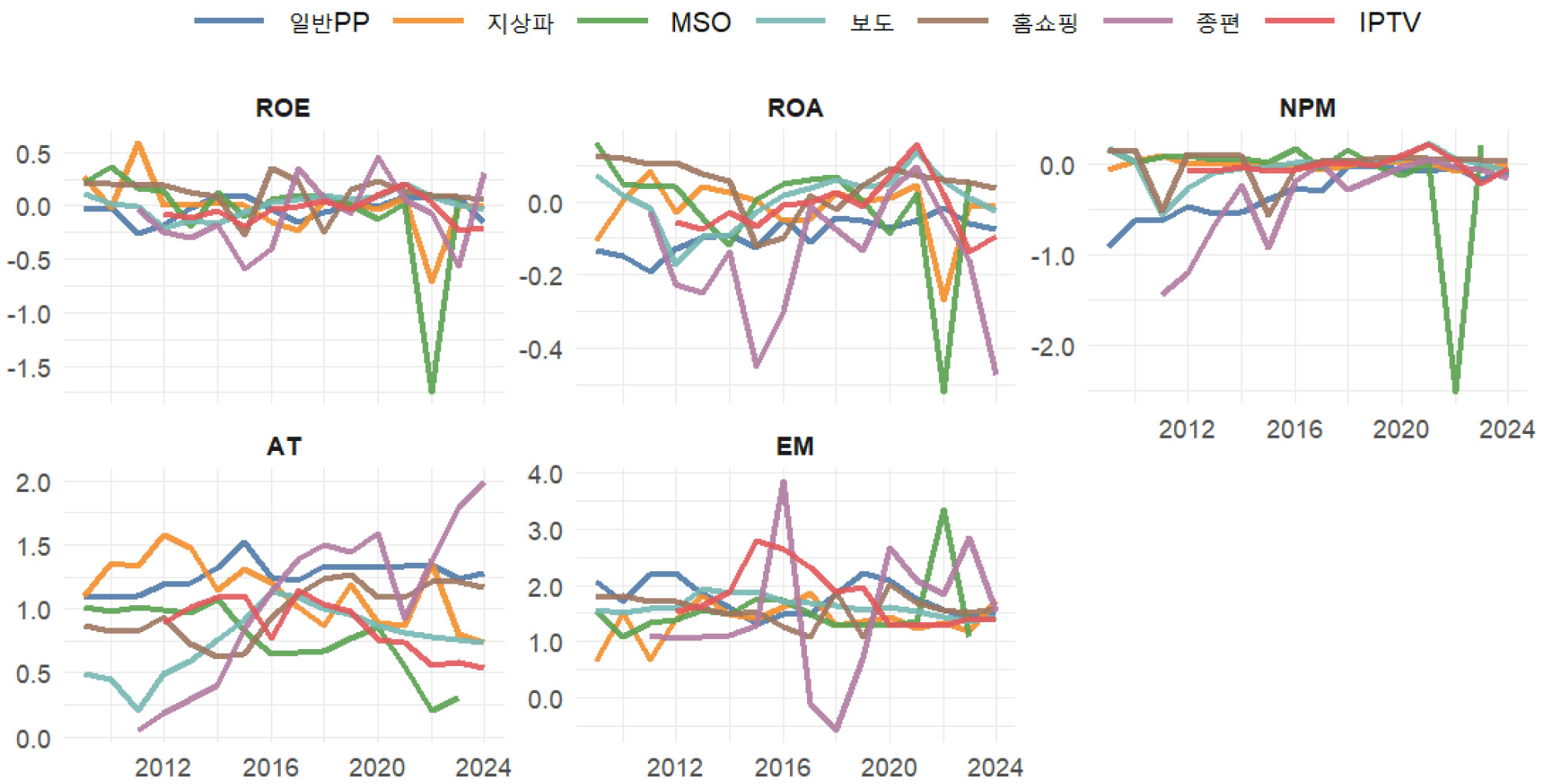 - 본 연구는 패널 자료를 활용해 방송채널사용사업자의 재무성과 결정 요인을 분석하였다. 고정효과 회귀분석, 동적 패널 GMM, 롤링 회귀분석 결과, 매출액 순이익률(NPM)이 모든 분석에서 일관되게 자기자본순이익률(ROE)과 총자산순이익률(ROA)에 양의 영향을 미쳤다. 이는 방송채널사용사업자의 재무성과가 자산 효율성이나 재무 레버리지보다 본원적 영업 수익성에 의해 주도됨을 의미한다. 반면 총자산 회전율(AT)은 방송산업 특성상 유의한 영향을 보이지 않았으며, 자기자본 승수(EM) 확대는 ROE에 부정적 영향을 미쳤다. 방송산업의 환경 변화에 따라 2024년 기준 다수의 방송채널사용사업자가 수익성이 동시에 악화하였다. 이는 방송산업이 성장에서 생존 중심으로 패러다임이 전환되었음을 의미한다. 이상의 결과를 토대로 방송채널거래시장의 지속 가능한 성과 개선을 위해 콘텐츠 경쟁력, 비용 효율화, 수익 다각화에 우선 초점을 맞출 필요성을 강조하였다.
